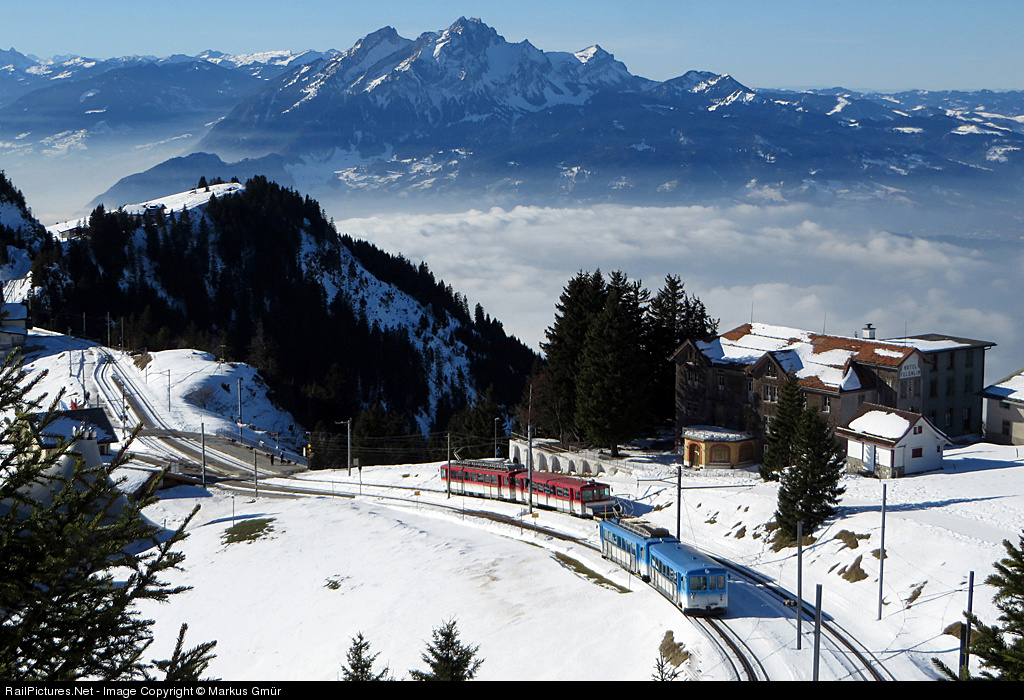 | What a beautiful winterday in the Swiss Mountains: Two trains arrives at Rigi Staffel (1604 meters over sealevel) on the left side. The blue train runs from Rigi Kulm (1750 meters over sealevel) to Arth-Goldau, the red one from Rigi Kulm to Vitznau. The peak in the background is called Pilatus (2070 meters over sealevel). Under the sea of fog is the Lake Lucerne and the city Luzern |
