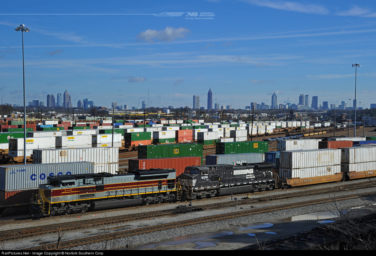 The Midtown and Downtown skylines of Atlanta can be seen in this view overlooking Norfolk Southern's Inman Yard in Atlanta, GA. Intermodal train 282, being led by the Lackawanna heritage unit, will soon depart the yard for another leg of its journey from Jacksonville, FL, to Chicago. Photo by Casey Thomason. For more information about Norfolk Southern, visit www.nscorp.com