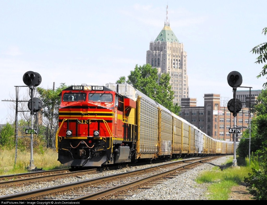 | It isn't very often that a Heritage locomotive will venture into Michigan, but when it does it's definitely worth finding. Here the Norfolk Southern 8114 splits the 47 intermediates in the New Center area of Detroit en-route to the Chicagoland area.