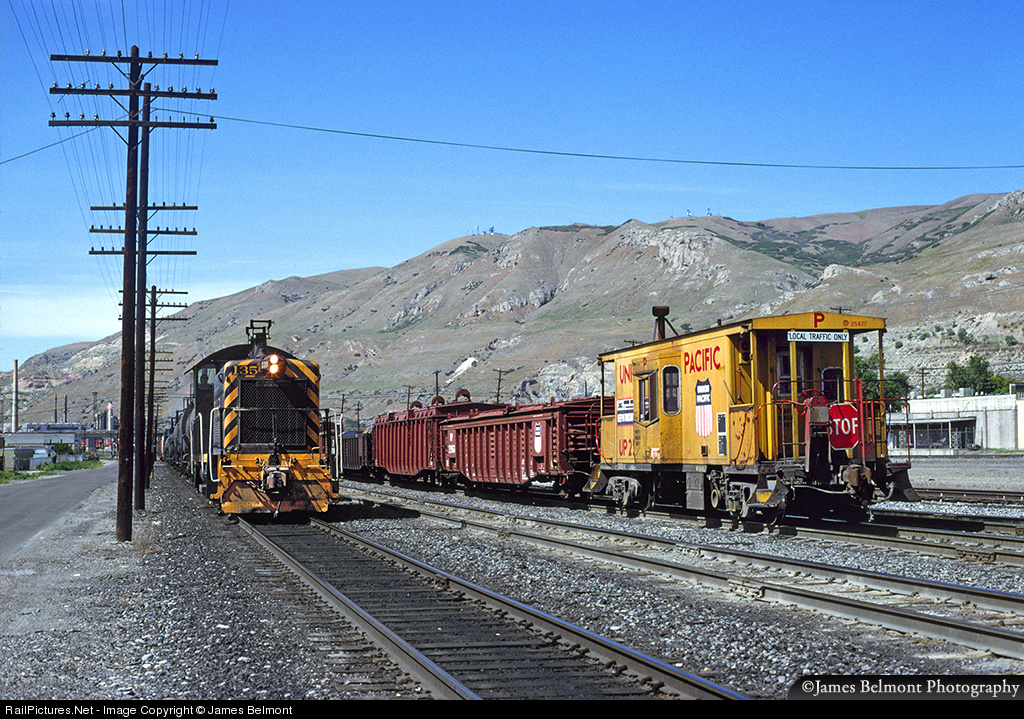 SP's Fourth South Switcher waits its turn through Grant Tower while UP's Provo Local rambles by headed for North Yard. The crew of the LUC51 added some custom signage to their CA-11 caboose No. 25821.