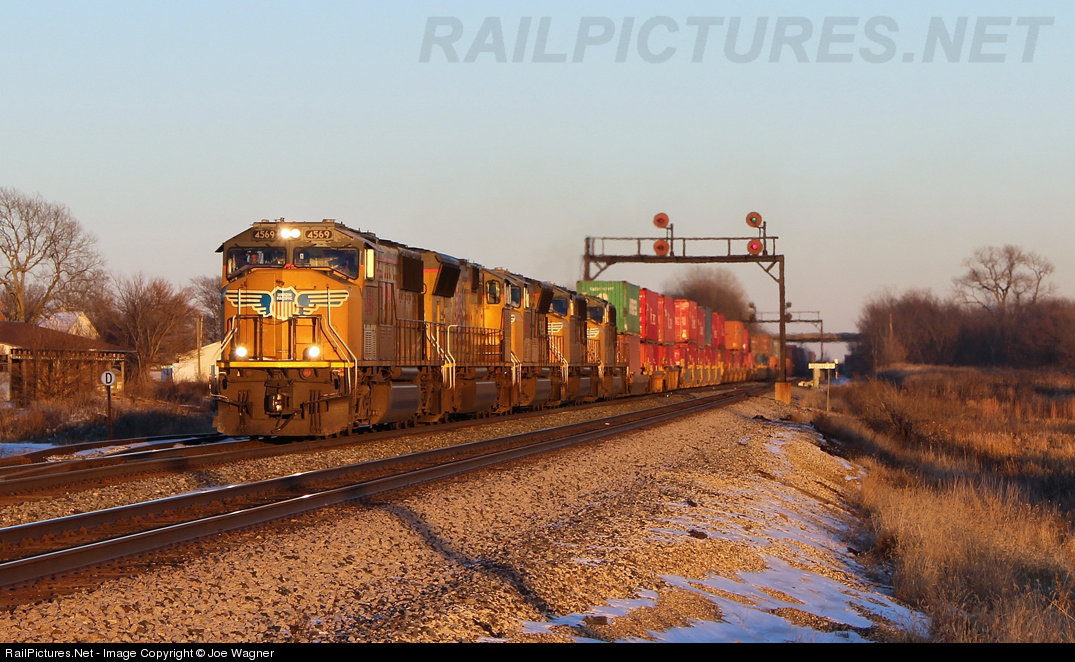 | On an absolutely bone chilling evening, five Union Pacific SD70M's lug the westbound Global IV Joliet to Long Beach, CA container train up Edelstein Hill. It's not everyday that you see an all EMD consist on the Chillicothe Sub. |