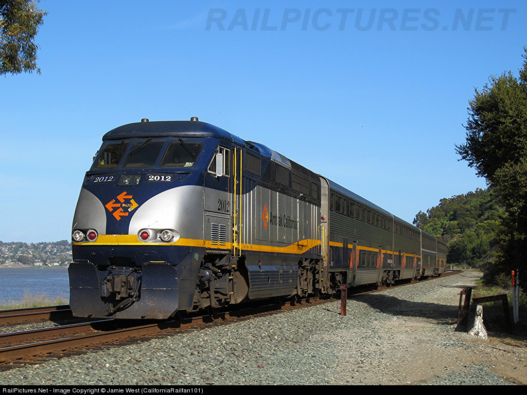 Amtrak California F59PHI #2012 shoves a Capital Corridor train past Eckley Pier as it makes it's way toward Sacramento.
