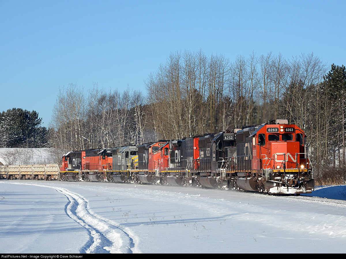 An empty limestone train from Minntac nears Proctor with an abundance of power. Classic "code blue" conditions with crystal clear blue skies, fresh snow, an air temp at -11F and a wind-chill near -30F. Nice for photos, not so nice for operating a railroad.