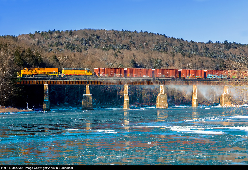 GWI-painted NECR SD40T-2 3317 leads the NECR SD40M-2 2714 across an icey White River with the ambient temperature this particular morning reaching 0-degrees F at the time of the photo.
