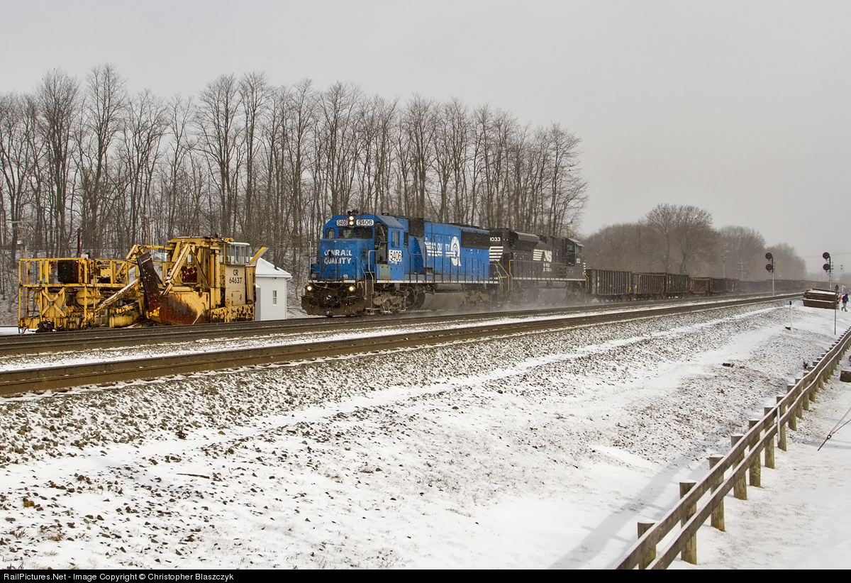 One last "Dress Blue." In February 2013, NS SD50 5406 (ex-Conrail 6712) was one of the final four Conrail-painted engines that remained on the active NS roster. I was lucky enough to be in central Pennsylvania when the 1983-built EMD product led a loaded steel slab train across the state, seen here passing another Conrail survivor, 1979-built Jordan Spreader 64637, still wearing its original Conrail number.