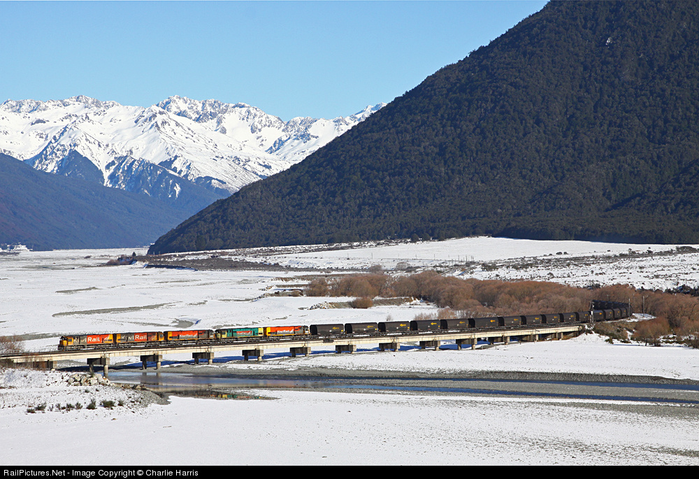 Trains on 3' 6" (1.067m) track from Whangarei to Bluff with virtually heritage rebuilt EMD and GE locomotives still the mainstay power. The network was privatized in 1990's and operated by Toll until 2008 when state owned KiwiRail was established.