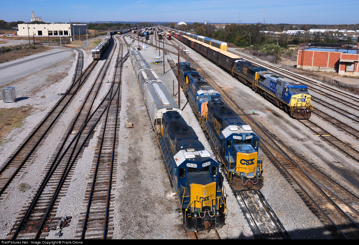 Lined up showing the three latest CSX paint schemes (boxcar, YN3 & YN2), the local jobs of Montgomery can be seen taking a break this Thanksgiving morning in the flat switching yard here. From left to right is M700, some lite power, Y221 and also the Kia train of Q220 behind it facing north. To the far left if G417 which just arrived a few minutes ago.
