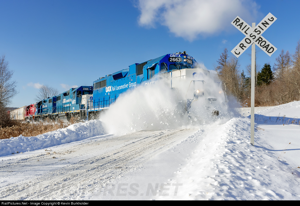 | GMRC train 263 rolls eastbound over Summit Road near Mount Holly, Vermont, with a trio of GMTX GP38-2s and a CLP GP38 as fresh powder is easily moved by the train. |