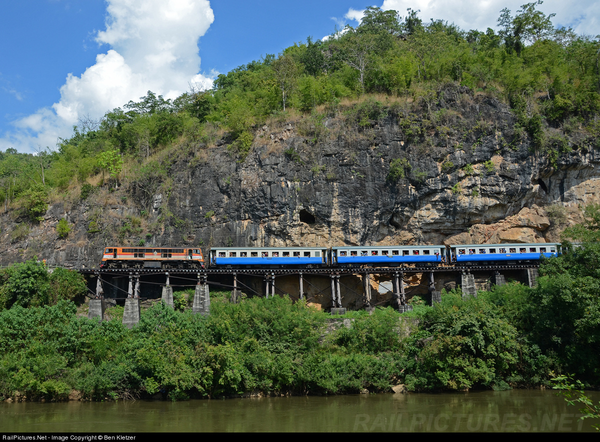 On a sunny December day, State Railway of Thailand GE UM12C #4045 leads Train #257 across the famous Wangpho Trestle. This curved trestle was built by enslaved Allied POW's during World War II as a part of the infamous Death Railway. Now this trackage is run by the State Railway of Thailand for tourist and local use. This train originated in Bangkok and is the only complete daily roundtrip from Bangkok to Namtok, a 420km tip that takes over 10 hours (when it is on time).