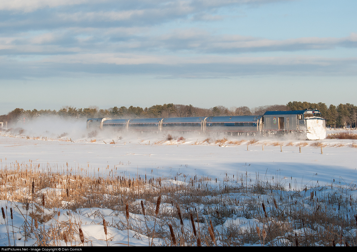 The afternoon after a night of heavy snow, Amtrak Downeaster Train 686 kicks up the snow as they fly through the Scarborough Marsh, heading to Boston. AMTK 90213 was leading and AMTK 16 was trailing.