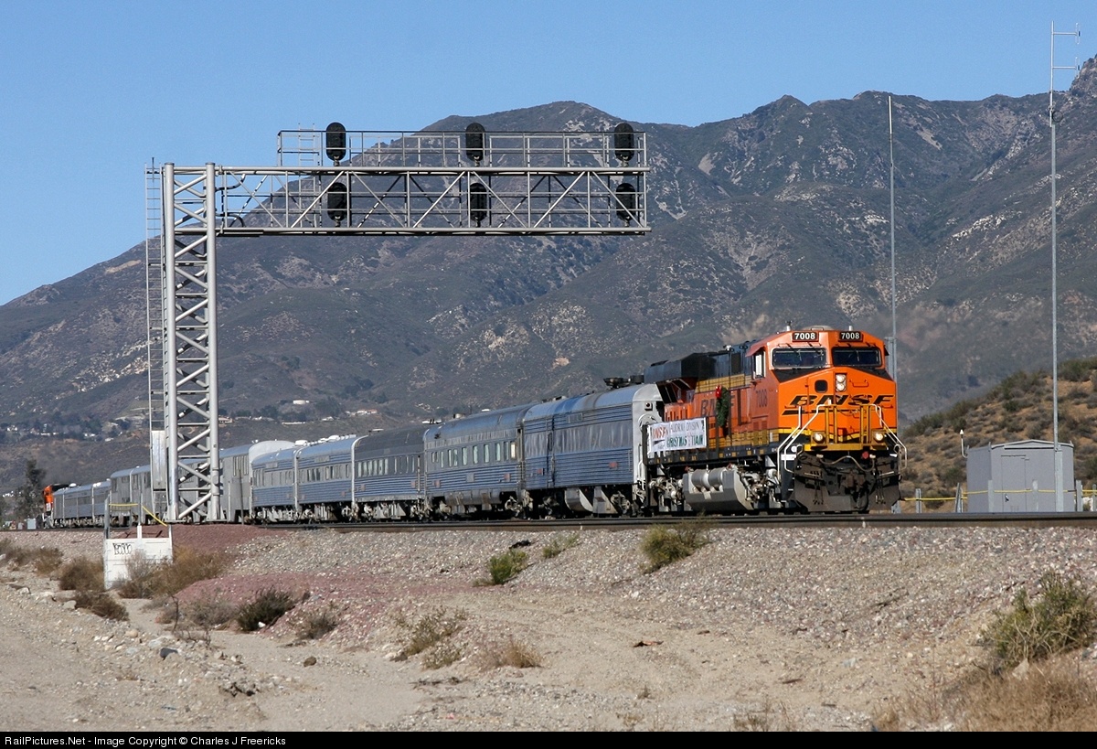 | The family edition of the annual BNSF Christmas train races back towards San Bernardino, passing under the signals at Verdemont behind a nice looking C4. |