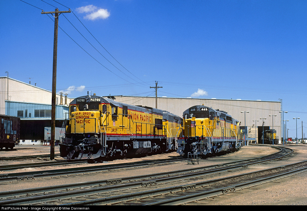 Union Pacific EMD SD24 No. 446 sits with GE U30C No. 2927 on the west side of the North Platte Diesel Shop in July 1984. No. 446 was originally built as SD24 demonstrator No. 7201 dressed in Southern Pacific colors in August 1960, but was purchased a year later by UP. Locomotive No. 2927 was a later-built U30C that UP added new to the fleet in 1976.