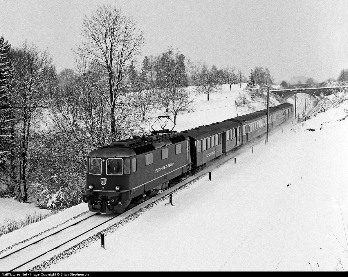 | The prototype Re 4/4 III loco, SOB No 41, hurries through the snow with the 09.27 Schaffhausen to St.Gallen train near Neukirch-Egnach. This loco is now SBB No 11351 when it and three sisters were swapped for the prototype Re 4/4 IV locos that to-day work some of the Voralpen Express services. |
