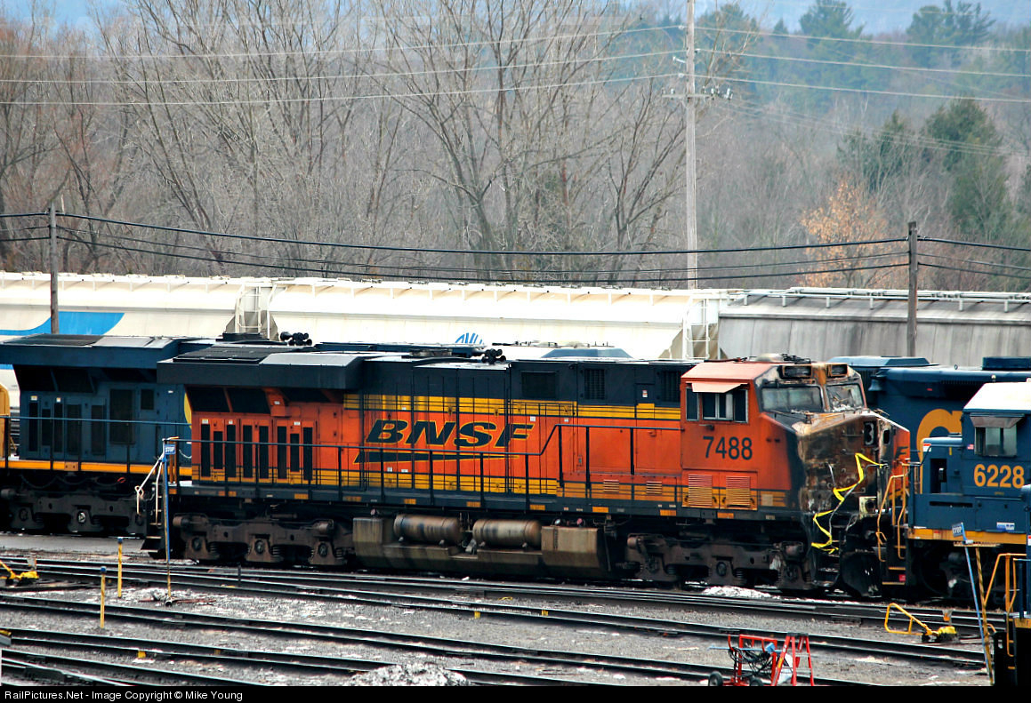 On December 6th 2013, BNSF 7488 Was The Lead Unit On K041 Coming North Up The River Line When It Hit A Car Carrier Truck, Within A Few Minutes I Believe The Truck Bursted In Flames, Lucky The Truck Driver And The Crew Escaped Ok, The Fire Was So Hot The Truck Was Completely Melted And Cause A Great Amount Of Fire Damage To The Lead BNSF Unit, Two Weeks Later, BNSF 7488 Sits Here In Selkirk Yard, BNSF Is Said To Come Out And Take A Look At The Unit To See The Damage And How They Will Get This Unit Back To BNSF For Repairs.