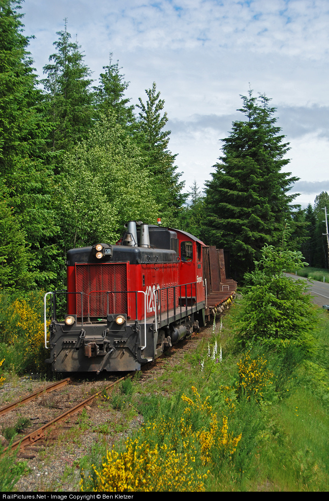 Simpson Timber Company #1200 leads a train of empties into a clearing in the forest on the way to the Dry Sort Yard at Mill Five. Soon this train will be paralleling the Shelton-Matlock Road on the way to Mill 5. This is the last operating remnant of the once extensive Simpson Timber Company system, where tracks once stretched up to 100 miles into the forests of the Olympic Peninsula in search of timber. The locomotive, SW1200 #1200 is a rare example of a SW1200 built with dynamic brakes in deference to the steep grades on the railroad which can reach up to 6%.