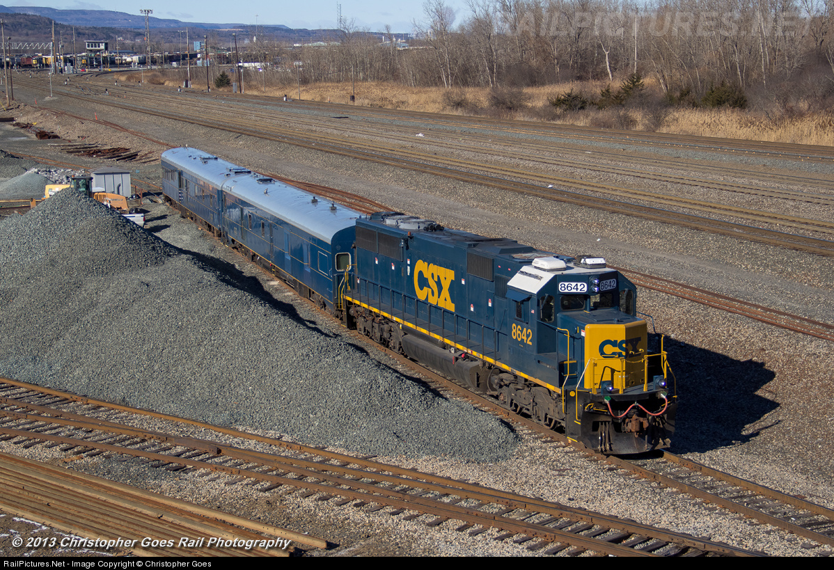 | A CSX Geometry Train stages at Selkirk awaiting it's next assignment on a very cold and windy November afternoon. It looks like the 8642 has an odd set of trucks on the back, or it's just me. If anyone has info on a modification to it please feel free to add, thanks. |
