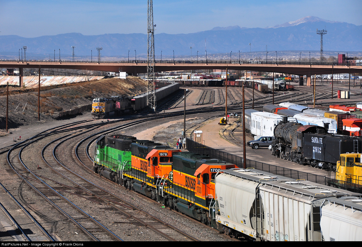 | With UP CCQNA having finally placed its units at the rear and head end of their empty hopper train, the BNSF 102 local comes back into the yard and passes a young railfan with his parents as they stop to take in the action from ground level of the Pueblo Railway Museum. |