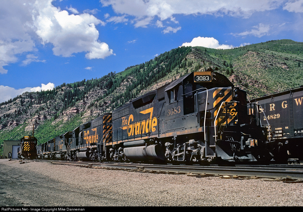 Denver and Rio Grande Western GP40 No. 3083 is the east unit on a helper set at Minturn, Colorado, in July 1984. Behind No. 3083 is a GP40-2, a SD40T-2, a SD45, and two more SD40T-2s. One track over in front of Minturn’s small enginehouse is GP35 No. 3043. These large helper sets were used on the steep 3-percent eastward grade up Tennessee Pass out of the crew change town of Minturn.
