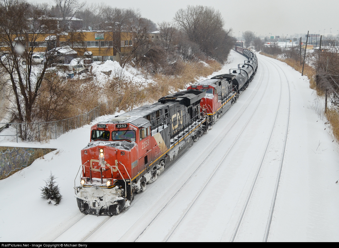 As the flurries fall, CN 2253 & CN 2687 are the head end power and CN 2526 the DPU unit on CN 305, with all units quite snow covered! This train normally passes through here in the middle of the night, but it was delayed due to the stormy weather. For more train photos, check out http://www.railpictures.net/photos/mtlwestrailfan/