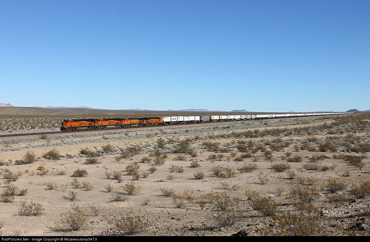 | From atop a small rise along BNSF's busy Needles Sub between Essex and Goffs, 6822 west races along the desert floor with a hot Z9 in tow. |
