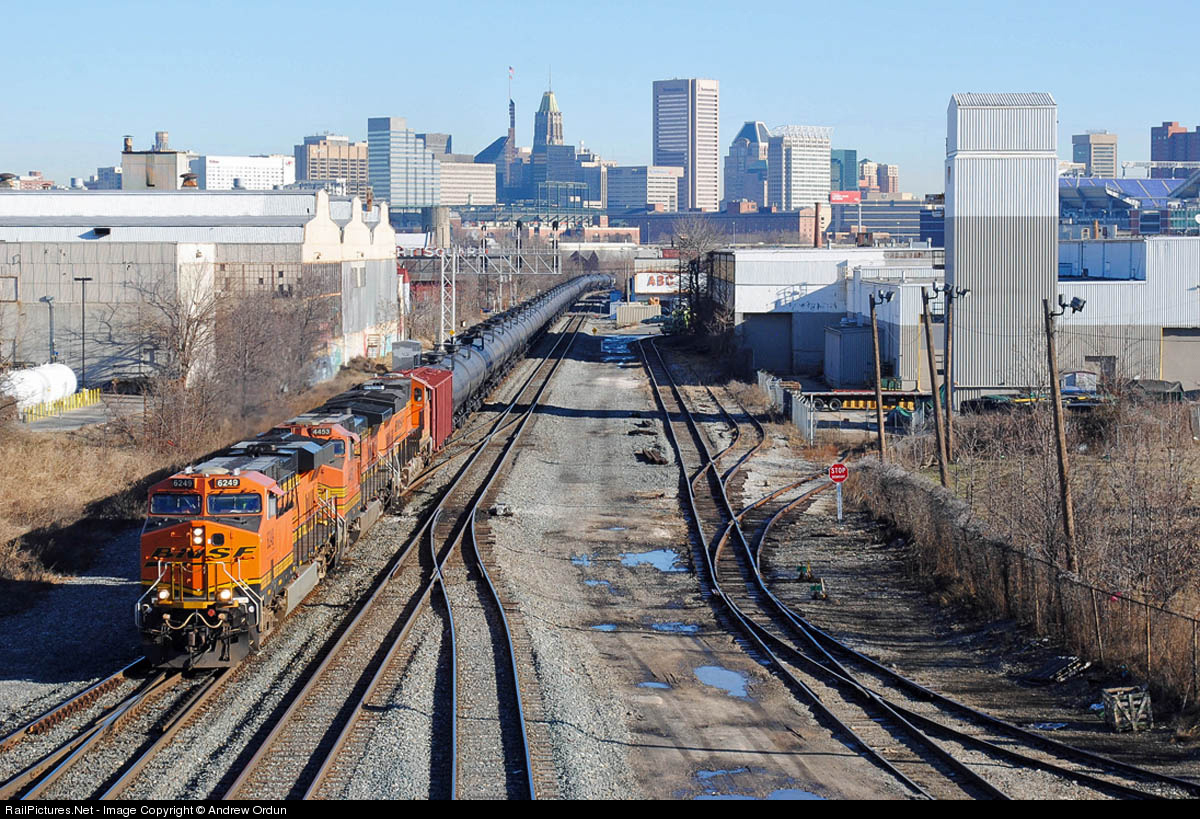| Detour empty oil cans K055 hammers west on the Baltimore Terminal Subdivision at Carroll. The Baltimore skyline, Oriole Park at Camden Yards, and M&T Bank Stadium tower in the distance. |