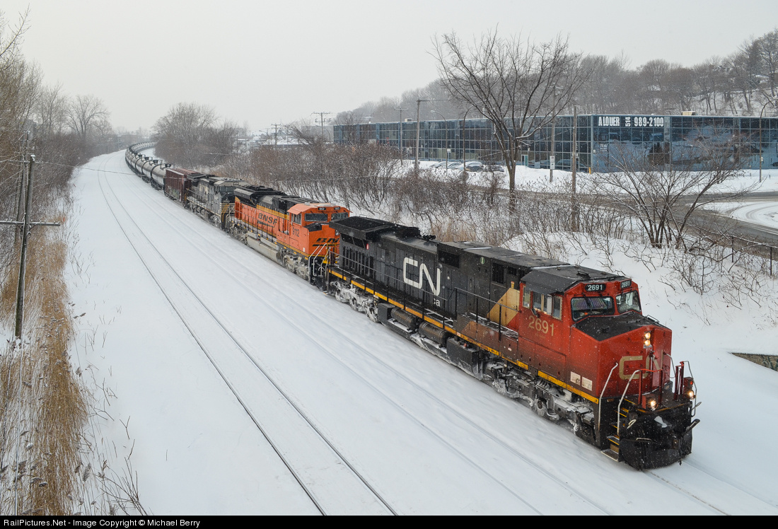 | CN 2691, BNSF 9112 & NS 8449 are the power on a loaded oil train which is about to stop for a crew change at Turcot West. For more train photos, check out http://www.railpictures.net/photos/mtlwestrailfan/ |