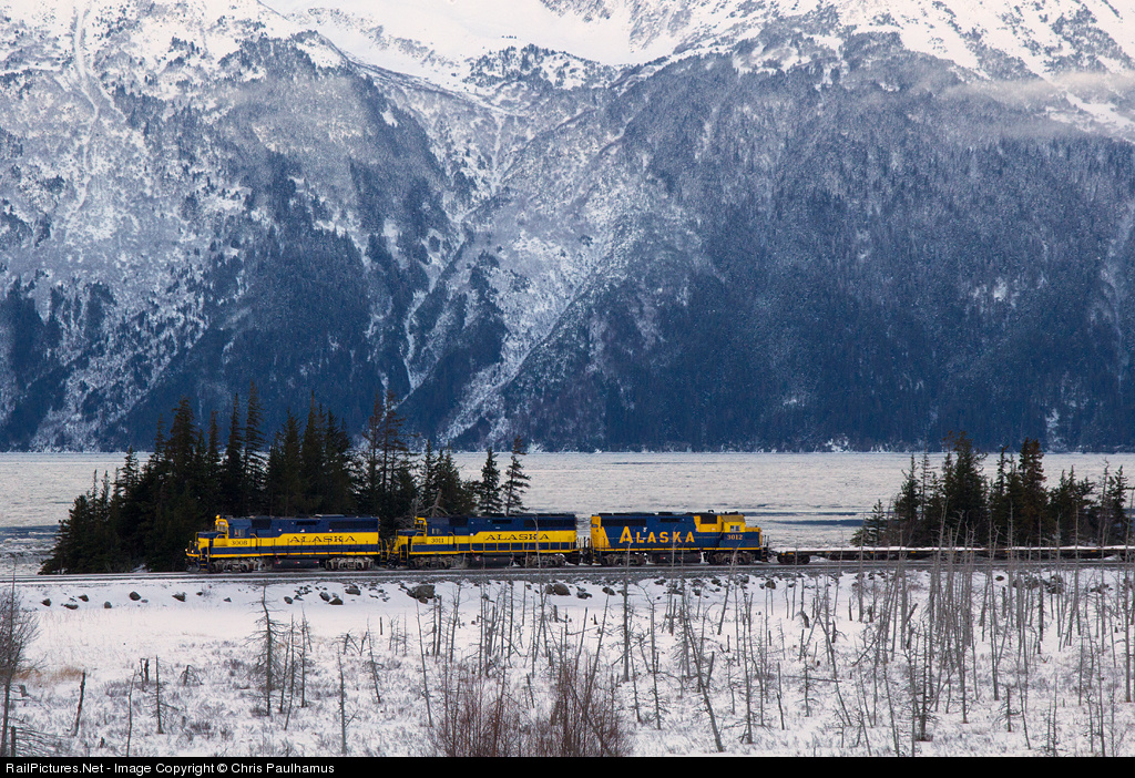 Ever wonder why you don't see many photos of the Alaska Railroad in the winter time? Well, for one, the tourists are gone which means less cameras by the tracks to catch any action. Another reason is the weather. If it's not snowing it's probably gonna be cloudy; sunny days are at a premium up here. Another reason is there's very little daylight to play with. The sun comes up mid-to-late morning and is setting before 4 PM. In other words, it's dark when you go to work, and it's dark when you leave. The biggest factor though is simply the lack of trains. This winter, the Alaska Railroad runs one passenger train a week, and it happens to run under the cover of darkness into and out of Anchorage and Fairbanks. They also generate one to two freight trains per week which run during the weekdays, so unless you have off of work, you're not seeing them. In order to get a shot, you need a multitude of factors to come together perfectly like they did here the day after Christmas as ARR 3008 leads a freight train to Whittier and a waiting barge. Well, almost perfectly...even though it's just after noon, the sun is still below the Kenai Mountains there in the background!