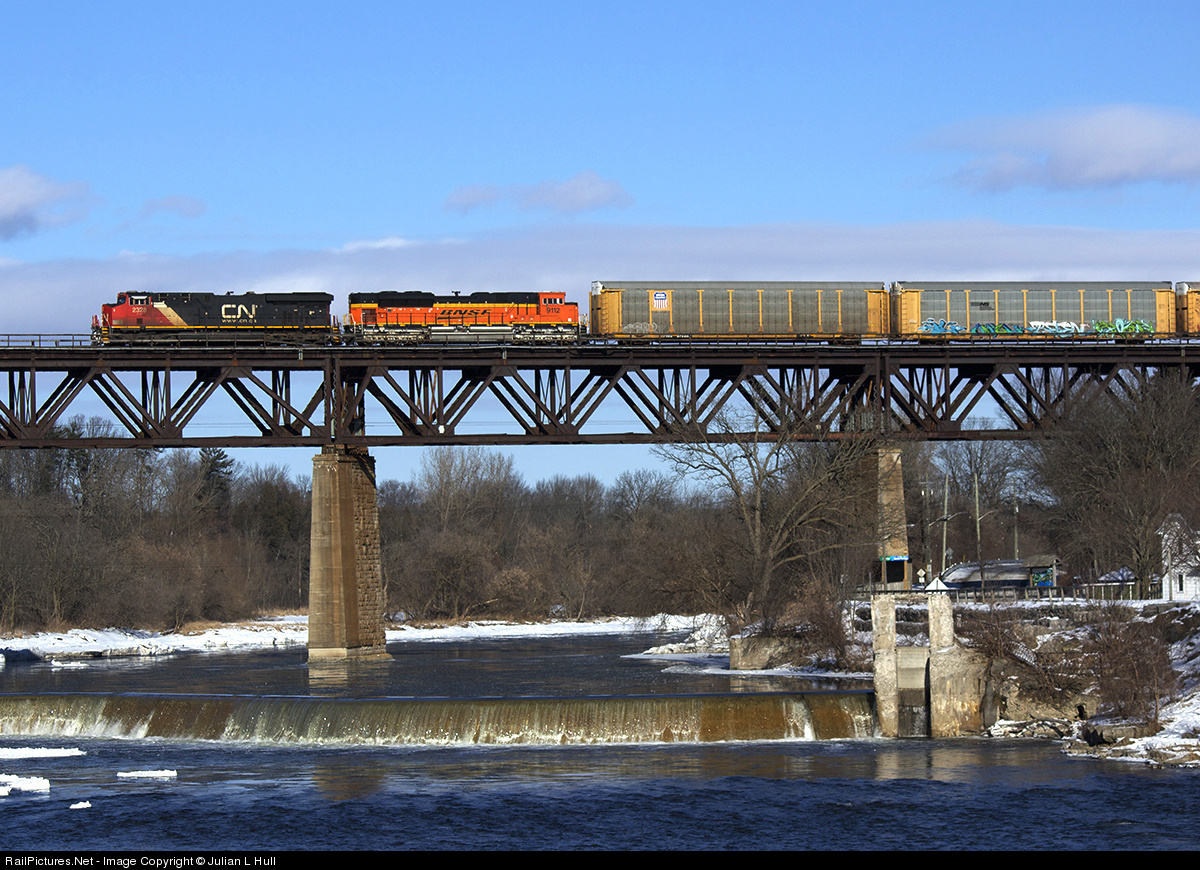| Foreign power was prevalent on this crisp winter day in southern Ontario, as evident in the above photo. Here, relatively new BNSF 9112 is seen lending a hand on train 393 as it passes over the Grand River. |