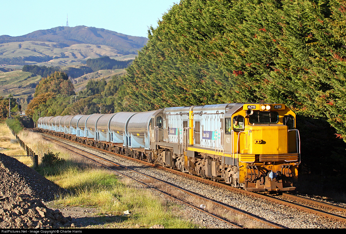 Trains on 3' 6" (1.067m) track from Whangarei to Bluff with virtually heritage rebuilt EMD and GE locomotives still the mainstay power. The network was privatized in 1990's and operated by Toll until 2008 when state owned KiwiRail was established.