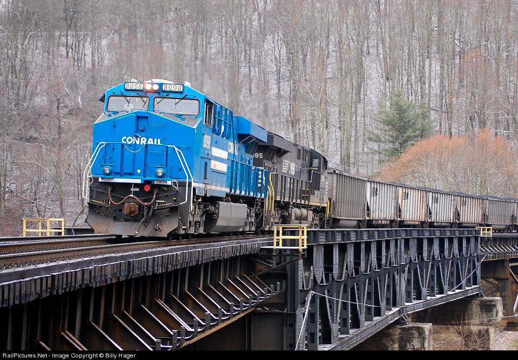 The Conrail Heritage unit assists Eastbound loaded coal train 83A across the Coopers Trestle, miles away from Bluefield.