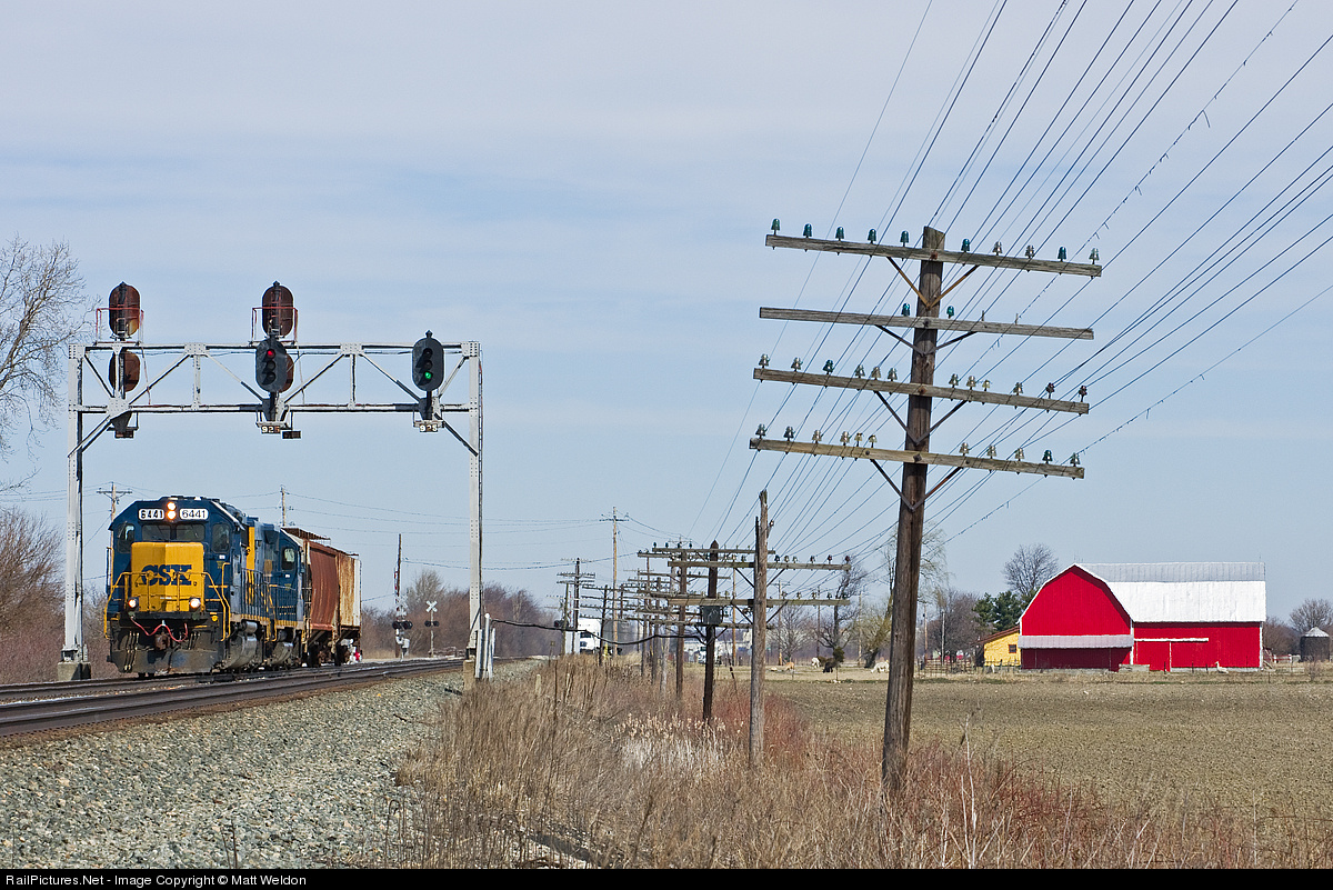 A local train CSX H793 passes a classic C&O signal bridge at Longley just north of Fostoria, Ohio. The CSX Pemberville Subdivision is one of the few railroads in the east that still has a functioning railroad pole line, where the signaling and power circuits are still in use, and the telegraph and telephone circuits long abandoned.