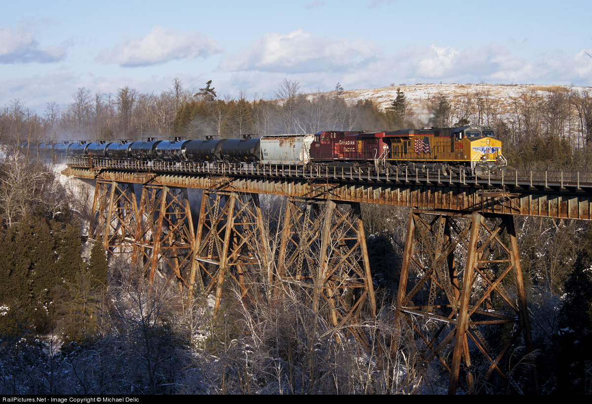 FPON! Foreign leaders are extremely hard to come by in Ontario, but with the increase in run through and leased power over the last couple months, it has become more popular. In this scene, UP 5296 leads CP train 609 (empty crude oil cans from Albany, NY) over the Cherrywood trestle.