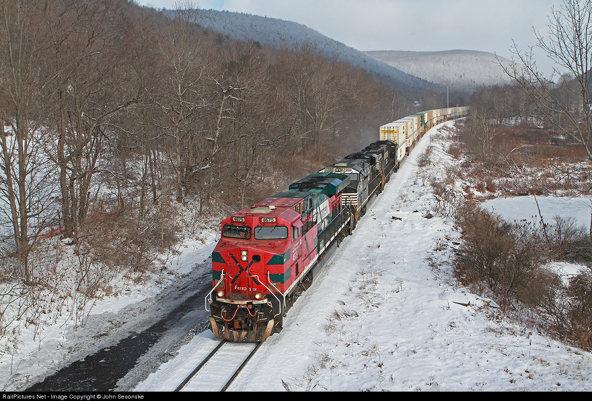 | Amid some weak sun and snow squall flurries, a Ferromex unit leads the Ayer to Chicago intermodal-Rack train down the old D&H mainline with 20 stacks out of Mechanicville and 51 racks from Ayer and Mechanicville. The train has just crested Richmondville Hill and is now rolling down the hill towards Oneonta. |