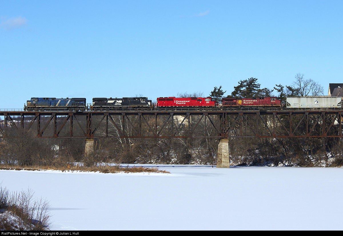 | CEFX bluebird 1055 is seen at the head end of train 243's colourful consist as it crosses the Grand River on its way to Wolverton, where it would meet an eastbound pipe train. |