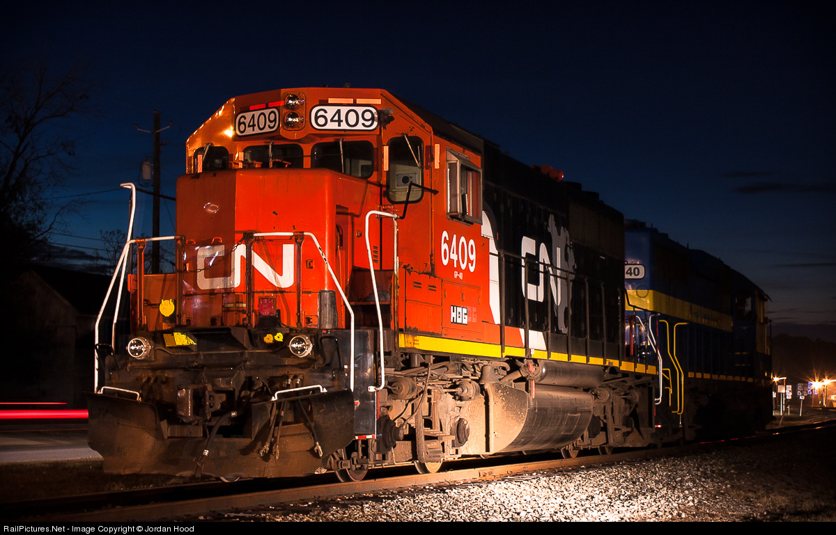 | One of the Heart of Georgia's GP40s, sporting the "CN North America" scheme of it's previous owner, rests at the interchange with G&W shortline Georgia Central in downtown Vidalia at dusk on a chilly December day. |