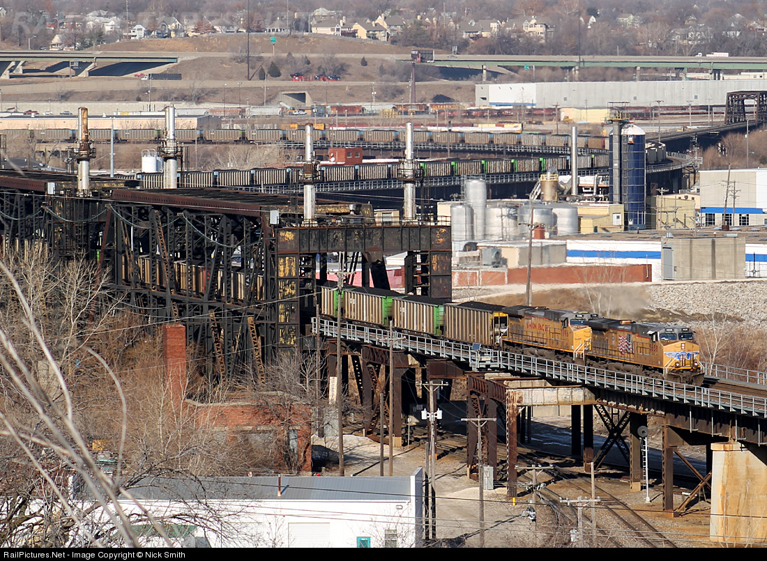 | A pair of UP AC4400's lead a loaded coal train up out of UP's Armourdale Yard and onto the KCT's High Line over Santa Fe Jct. The train is just about to cross the state line into Missouri and take the KCT main across Kansas City. |