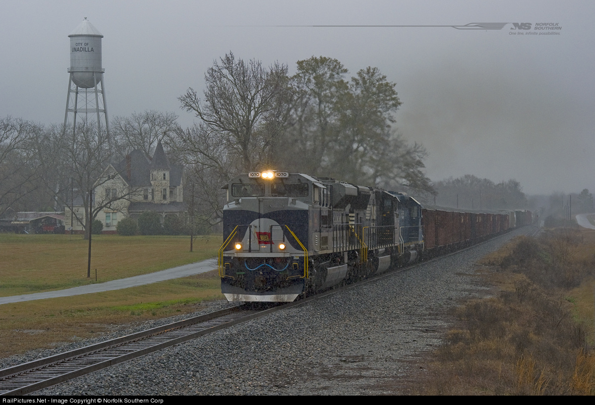 Georgia Division train number 151 operates daily on the GS&F District between Macon and Valdosta. The first run of 151 for the year 2014 featured the Wabash heritage unit (SD70ACe #1070), and lots of fog and rain. The train is seen here powering up from the Elko bottoms, cresting the hill at milepost 44 into the town of Unadilla, GA. Photo by Casey Thomason. For more information about Norfolk Southern, visit www.nscorp.com