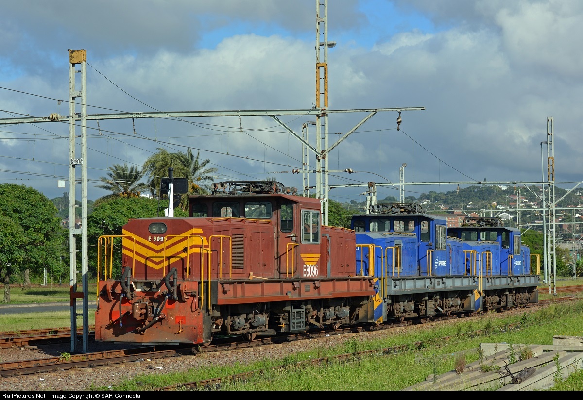 | Three of the remaining survivors of the original 100 that entered service between 1983 and 1985 for South African Railways - an additional 7 were built for the mining industry. Class 8E, centre cab, electric shunters, E8096 / E8090 / E8012, just after sunrise this morning at Bayhead Yard. The number of these locomotives still in service has been radically reduced in recent years as spares became unavailable. Those that have already succumbed are now being used as parts donors to keep the remainder of the fleet running. It is estimated that only approximately 40 are now still in regular service (excluding those that remain from the additional 7 for the mining industry).