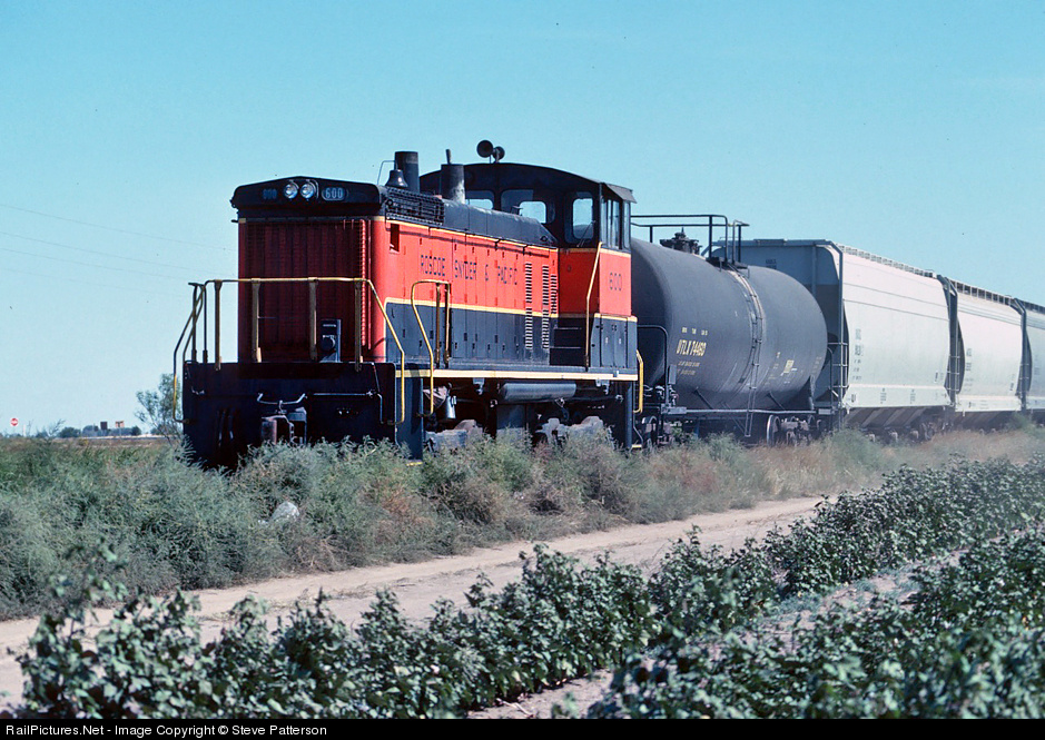 Roscoe Snyder & Pacific 600, SW-1500, kicks west Texas dust off the right of way tumbleweeds amid the cotton fields at Roscoe on Oct. 17, 1989 as it delivers repaired cars back to the U.P. The 32-mile shortline formerly existed to interchange traffic between the Santa Fe and Texas & Pacific even both lines connected at Sweetwater, Texas. The Staggers Act of 1980 eventually caused It to be abandoned in 1984, expect for this 1.5 mile portion serving a car repair shop.