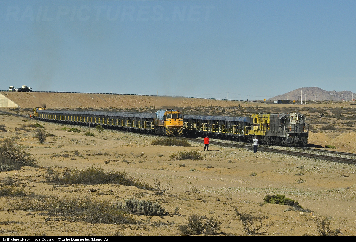 | Two FERRONOR iron trains crossing, both trains with double tracction of EMD GR12U, crossing in Tamarico passing loop, train loaded up to Chehueque with helper EMD GT26CU-2 locomotive. |