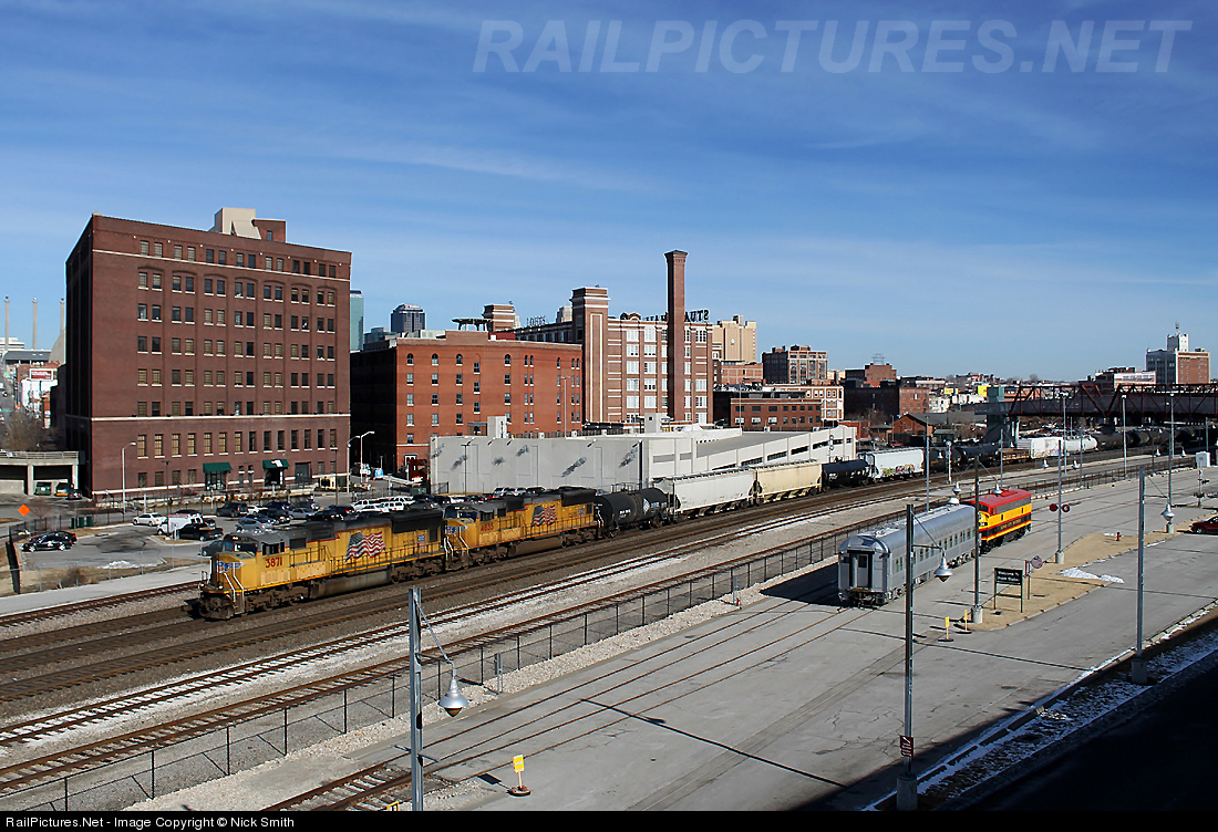 | A pair of Union Pacific SD70M's lead a freight train across the KCT at Union Station. The train is taking a trip "Around the World" as its called, requiring the train to make a full loop around the city to get into Neff Yard. With the incline out of service, this trip is a little longer than usual having to cross the Kaw River twice to make it's turns back east. |
