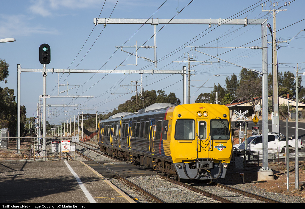 A set of 3100 class diesel electric railcars approach Marino Rocks station, on the coastal section of the Noarlunga line. After many years of procrastinating the Adelaide suburban network is finally being partially electrified, with the overhead complete in this section the days of DMU's running to Noarlunga are numbered.