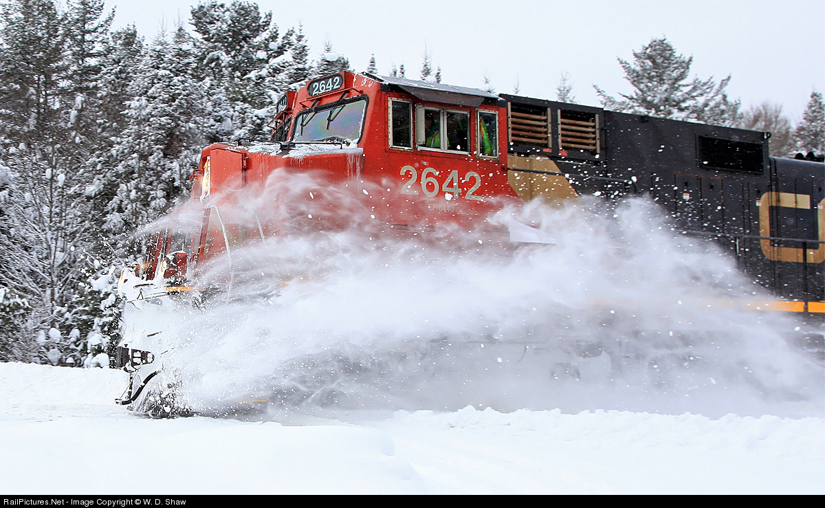 With the tracks mostly cleared by the passage of CN 451 a couple of hours earlier 450's journey has been quite a bit easier since their meet at Novar. The damage to 2642's handrails, the result of a collision with a downed tree around Mile 116 of the Newmarket Sub as it was leading yesterday's 451 north, is quite evident in this shot.