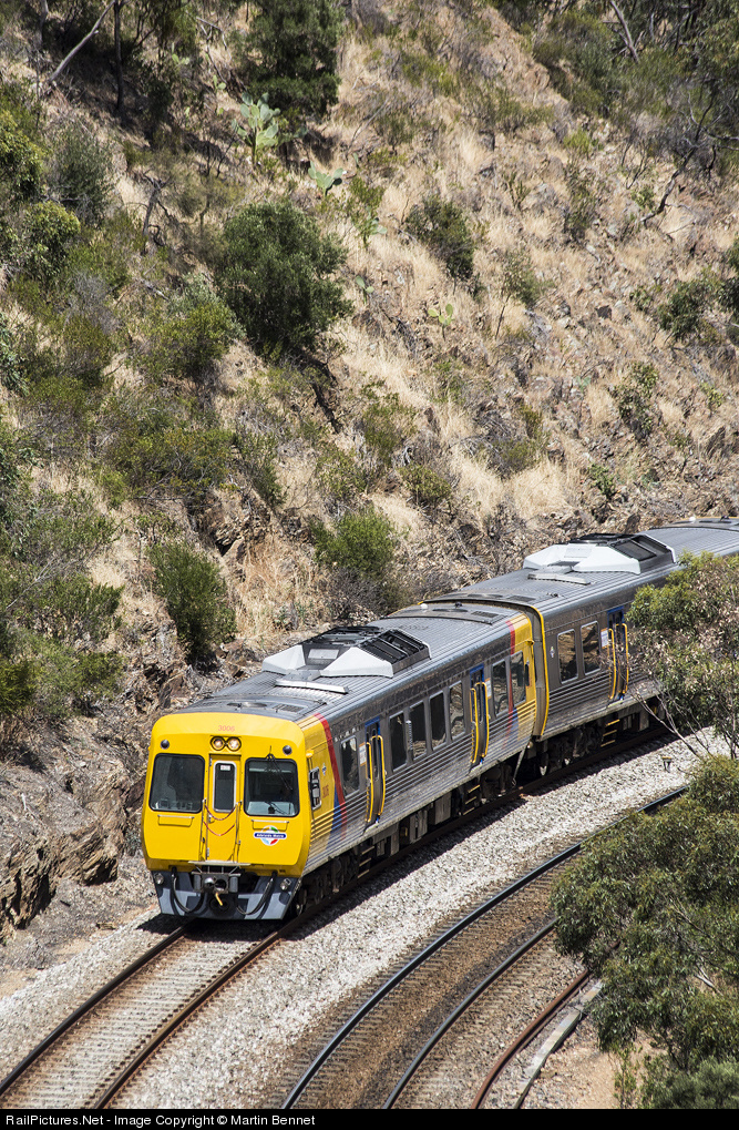 A 3000/3100 class suburban DMU rolls down grade through the scenic Adelaide Hills, with a service from Belair.