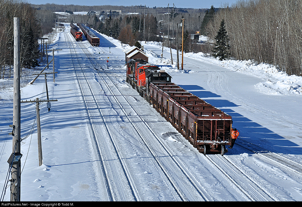 | A loaded taconite train for the Iron Range has to hold back while a switch job moves some bad order set-outs around before coming into the CN Proctor yard. Another string of taconite loads waits to be brought over the scale before coming in. All the pellets will eventually make their way down to the CN ore dock at Duluth, MN for shipment. |
