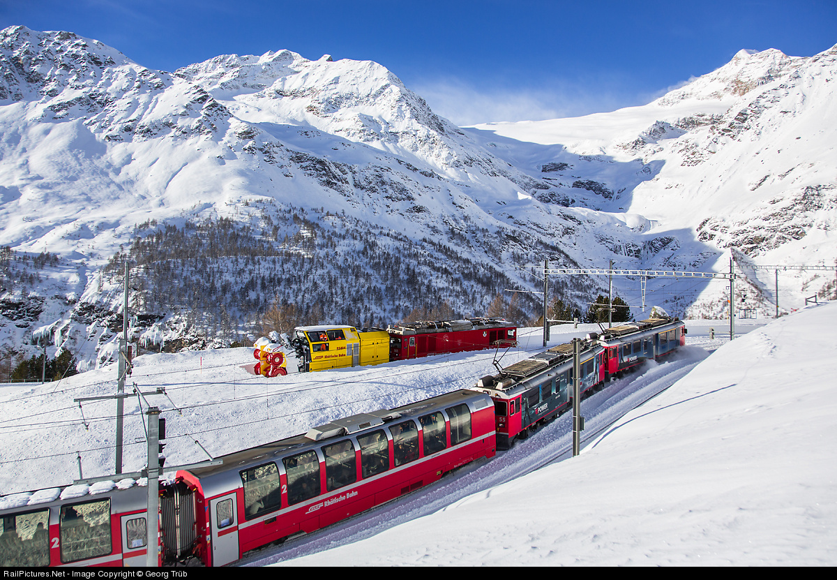 When train 1636 from Tirano to St.Moritz, pulled by ABe 4/4 # 56 and 55, was entering Alp Grüm station through the panorama curve of more then 180 degrees, the snow blower X rot mt # 95404 with locomotive Gem 4/4 # 801 had just cleared the stub track from about 1 meter of snow. In the background from the left Cournasel (2808 m), Piz Varuna (3453 m), Palü glacier an east summit of Piz Palü (3882 m).