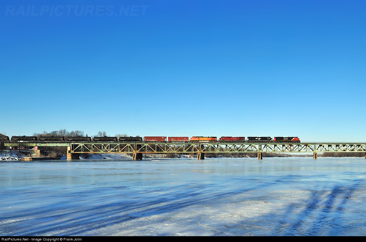 With locomotives from four railway and destined for the Valero refinery at St-Romuald, Canadian National oil train #710 crosses the Richelieu River at Beloeil. In the evening of June 29th, 1864, a passenger train plunged through the open swing span, resulting in the loss of 100 lives of passenger and crew. The train was carrying German immigrants from near Quebec City to Montreal. To date, this remains the deadliest passenger train wreck in Canada.