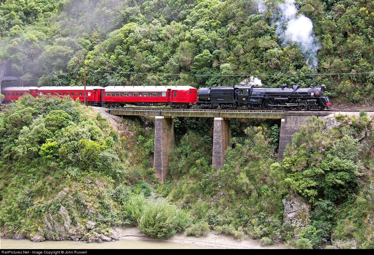 Steam Inc excursion from their Paekakariki depot to Masterton via Woodville has just passed through tunnel 1 in the Manawatu Gorge. Photo taken from Highway 3 which clings to the the other side mostly on bridge sections. The line was built with 5 tunnels late 1880's mainly by hand.