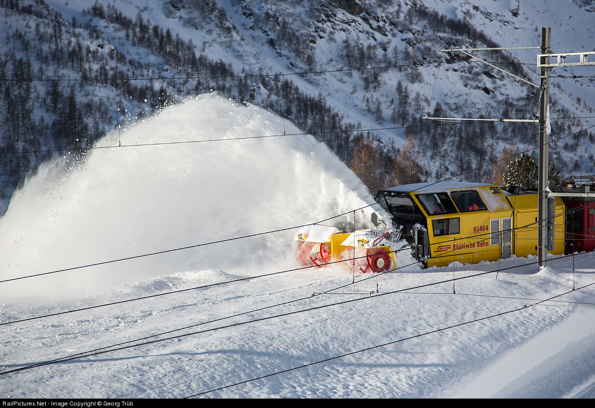The snow blower crew from Pontresina is clearing the stub track on Alp Grüm with the powerful "La Bestia" ("the Beast") from about 1 meter of fresh snow fallen in the two previous days. The engine is in "first drive" mode, which means that the blower drums are set to 3.6 meters width and the snow is evacuated down to 8 cm above top of rail.