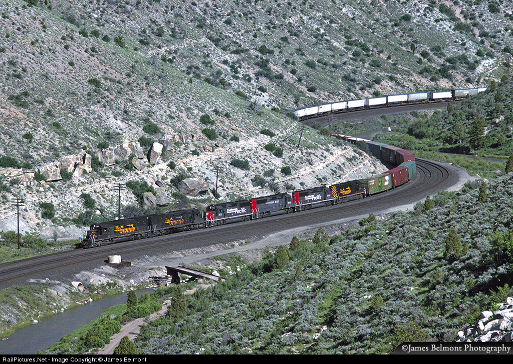 SP's Fifth Help (with two SD40T-2s) works in tandem with four GP60s to pull a 47 car Denver to Roseville Forwarder through Kyune along the Price River. The box cars behind the power are loads of Coors beer from Golden, Colorado.